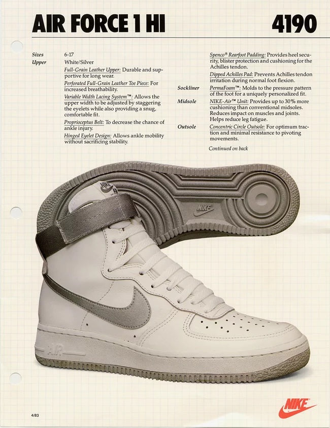 C’est devenue la toute première paire de basketball à contenir la technologie “AIR” de nike, une technologie qui apporte un meilleur amorti grâce à une capsule d’air emprisonnée dans la semelle. Son nom lui vient de celui de l’avion présidentiel des Etats-Unis (afin d’illustrer les hauteurs impressionnantes que les joueurs pouvaient atteindre sur les parquets avec cette paire). Commercialisée à partir de 1982 initialement dans sa version high, elle rencontre un véritable succès aussi bien sur les terrains de basket que dans la rue, mais dans un souci de renouvellement permanent nike décide d'arrêter sa production en 1984 et de sortir la air force 2.